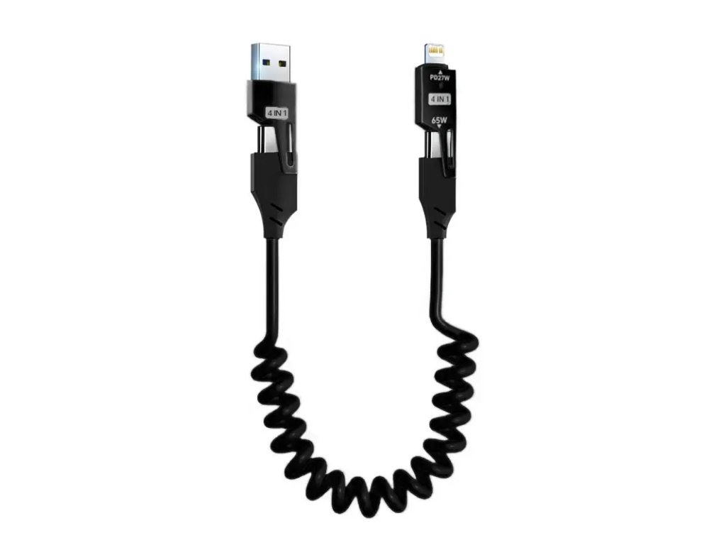 Praktický 4v1 rychlonabíjecí spirálový kabel je ideálním řešením pro každého, kdo hledá univerzální a odolný kabel pro každodenní použití. Díky chytrému spirálovému teleskopickému designu se kabel přizpůsobí vaší potřebě – při používání se natáhne až na 1,5 metru a po odpojení se automaticky stáhne zpět, takže se nezamotá a snadno se skladuje.