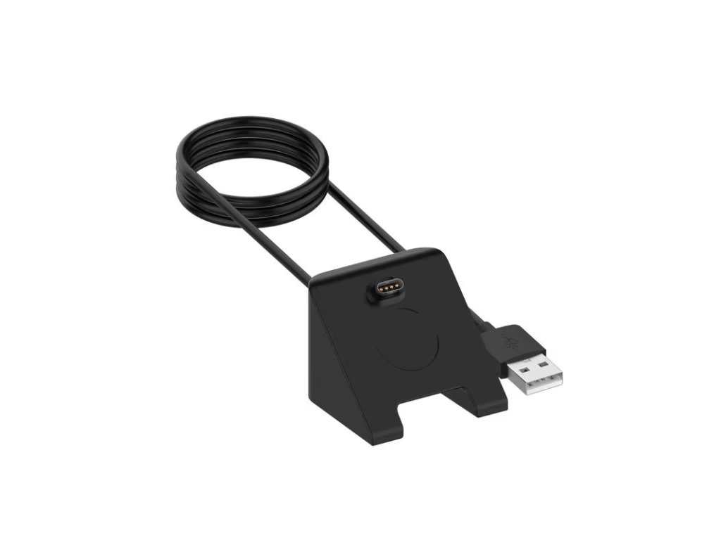 Součástí je kvalitní integrovaný kabel o délce 1 metr zakončený USB-A konektorem, který zajišťuje univerzální kompatibilitu s běžnými nabíječkami, adaptéry nebo USB porty. Samotný dok má magnetický 4-pinový konektor, který hodinky automaticky přichytí a zajistí pevné spojení pro efektivní nabíjení. Povrch je vyroben z odolného plastu v matném černém provedení, které ladí s většinou modelů Garmin.
